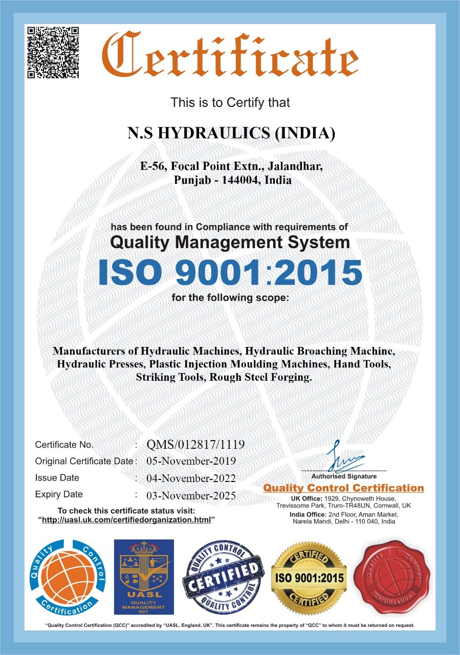 N.S. Hydraulics (India) is the first company to manufacture Hydraulic Broaching Machine in Punjab region. The company has manufacturing various Hydraulic Machines for Hand Tools, Automotive manufacturing, Plastic Moulding industries as per customer requirements.